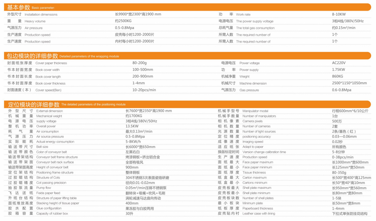 The machine is mainly divided into two parts: positioning module and four sides of leather case. It can realize automatic paper feeding, automatic glue passing, automatic positioning, automatic edge wrapping and automatic bubble pressing in the production of various leather cases and linings, and complete a series of technological processes automatically. Accurate alignment and fast version conversion. The positioning module includes black-and-white belt, double lens, automatic deviation correction, skin plate lining positioning and five plate positioning. The servo cam cable action of the hemming module is designed and produced by our company, and has obtained a number of national patents.